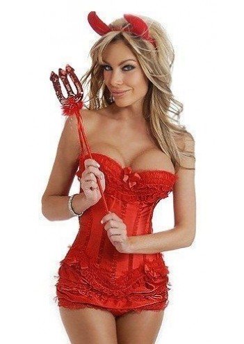 Корсетный костюм дьяволицы выполнен в огненно красном цвете. В комплект костюма входит открытый корсет без бретелек, с задней шнуровкой. Корсет украшен атласными бантиками и кружевом. Также имеется мини-юбочка, рожки и красный трезубец. Этот костюм подойдет для Хэллоуина и романтических вечеров.