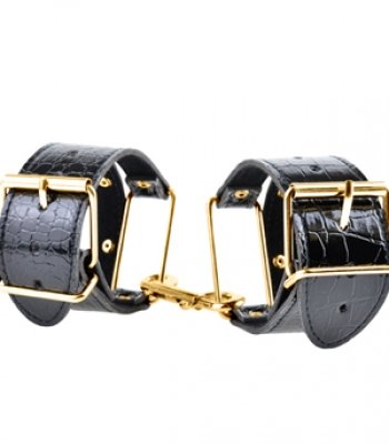 Наручники из черной искусственной крокодиловой кожи с золотыми пряжками и золотым карабином. Стильный выбор для эротических игр. Наручники прочно зафиксируют руки вашего партнера, что позволит вам реализовать сексуальные фантазии.
