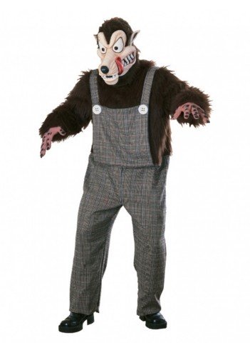 В костюм злого волка входит комбинезон в виде волосатого тела, с клетчатым фартуком и штанами, а также злостная маска и перчатки.