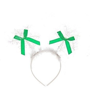 Новогодний ободок со снежинками - белый пластиковый ободок, украшенный пластиковыми снежинками с зелеными бантиками, станет прекрасным аксессуаром для новогодней вечеринки в кругу друзей.