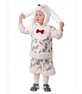 Костюм беленького зайчонка - милый мягкий костюм, который включает в себя шортики с рисунком, жилет с меховой отделкой и красной бабочкой, а также шапочку-маску с ушками в виде мордочки зайчика.