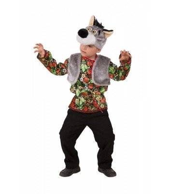 Детский костюм Волка Еремы выполнен из атласного материала и искусственного меха. В комплект костюма входит черная рубашка с принтом под хохлому, серый меховой жилет, а также шапочка-маска, выполненная в виде мордочки волка с черным носом и светлыми ушками.